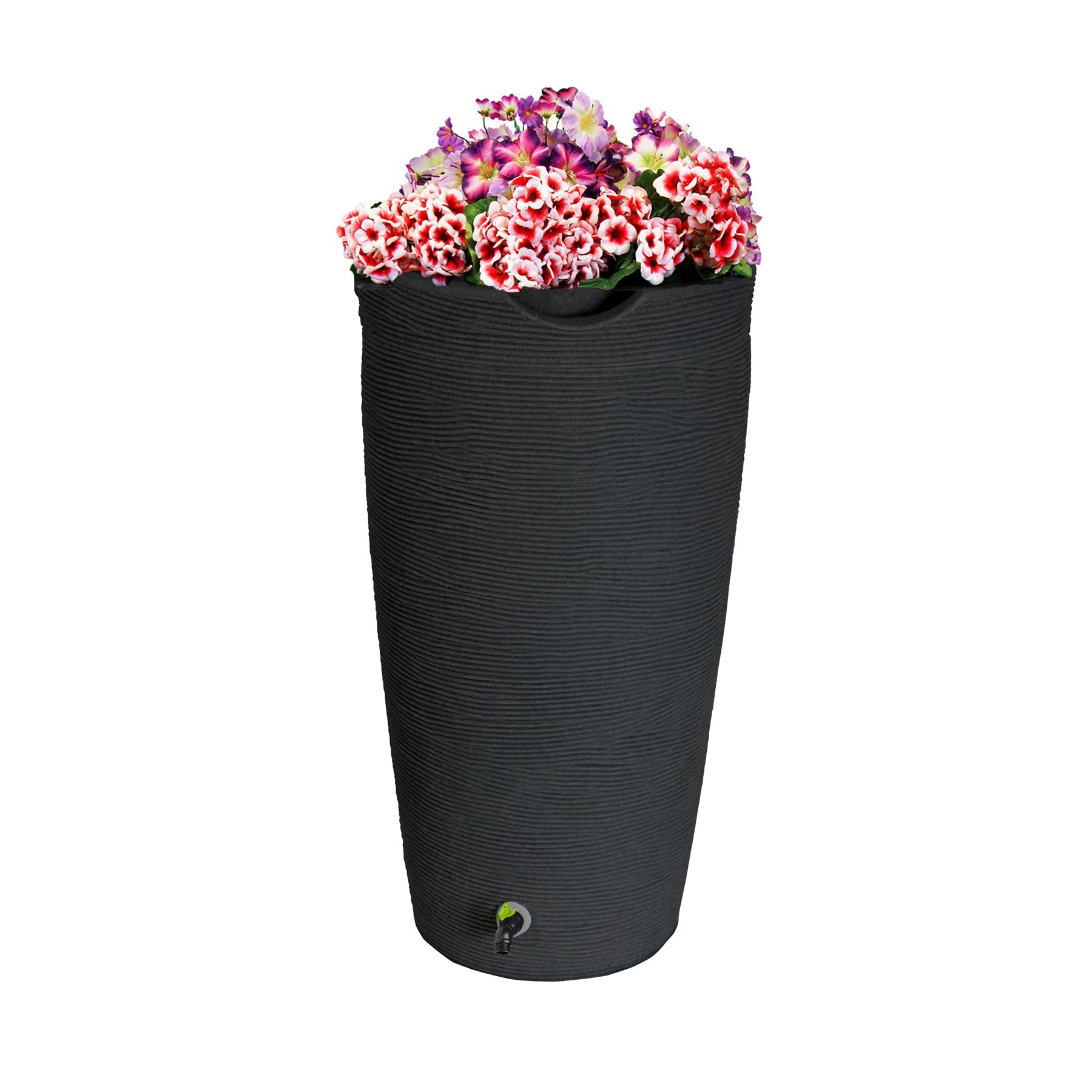 The Impressions Eco Stone 50 Gallon Rain Saver reinvents how you look at rain barrels. Made with 100% recycled material, this 50-gallon design is perfect for virtually any home. The most captivating feature is its appearance emulating an artisan clay stria vase. The Impressions Eco Stone 50 rain barrels are available in 2 options. The Impressions Eco Stone 50 Gallon Rain Saver has a planter top that allows the planting of a small herb garden or decorative flowers. The Impressions Eco Stone 50 Gallon Rain Saver 2-Piece has a flat top design, a removable lid, and comes with a stand to elevate your barrel.